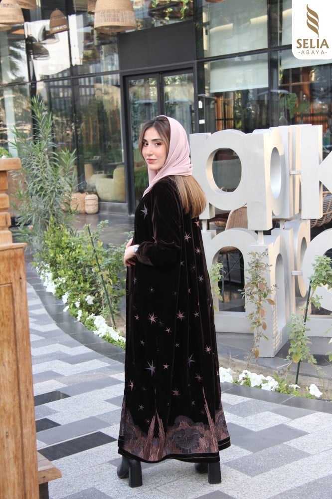 - قماش المخمل الفاخر: يمنح قماش المخمل للعباية ملمسًا ناعمًا ولمعانًا فاخرًا، يعزز أناقتها وجاذبيتها.