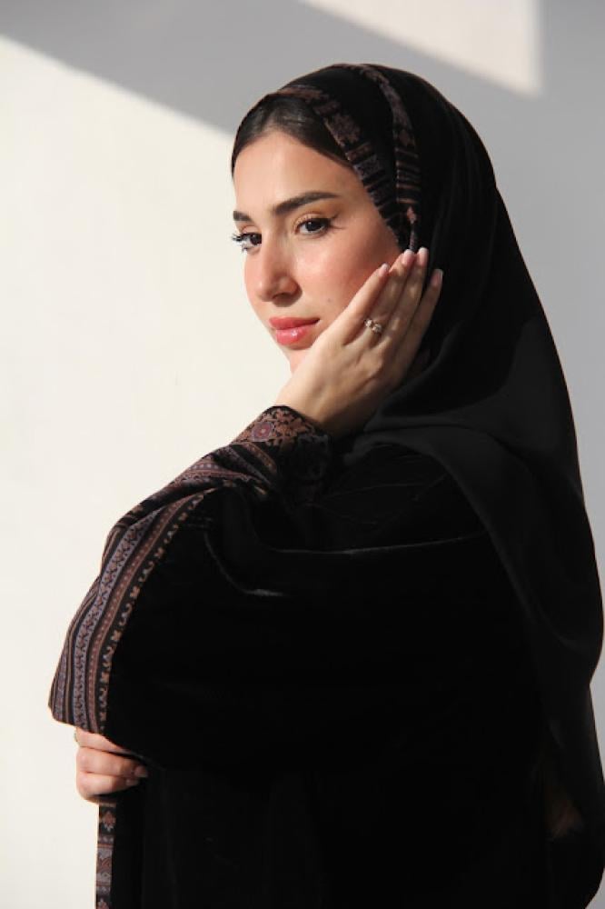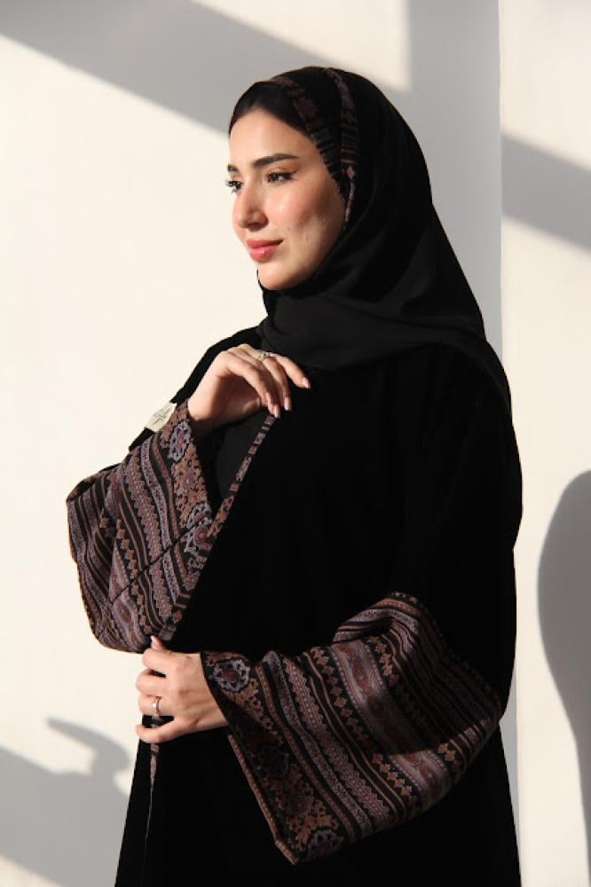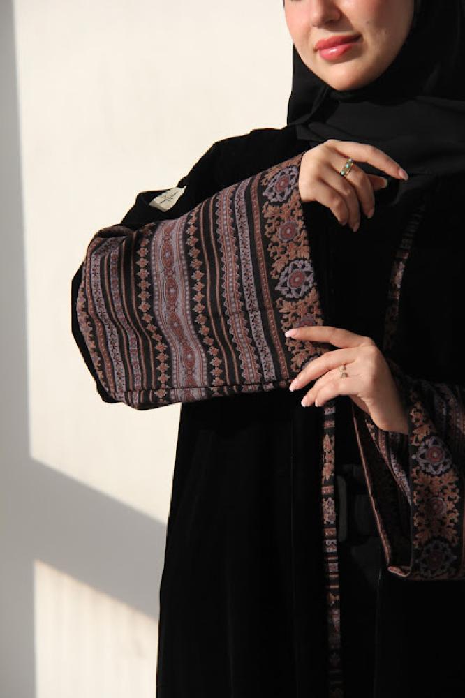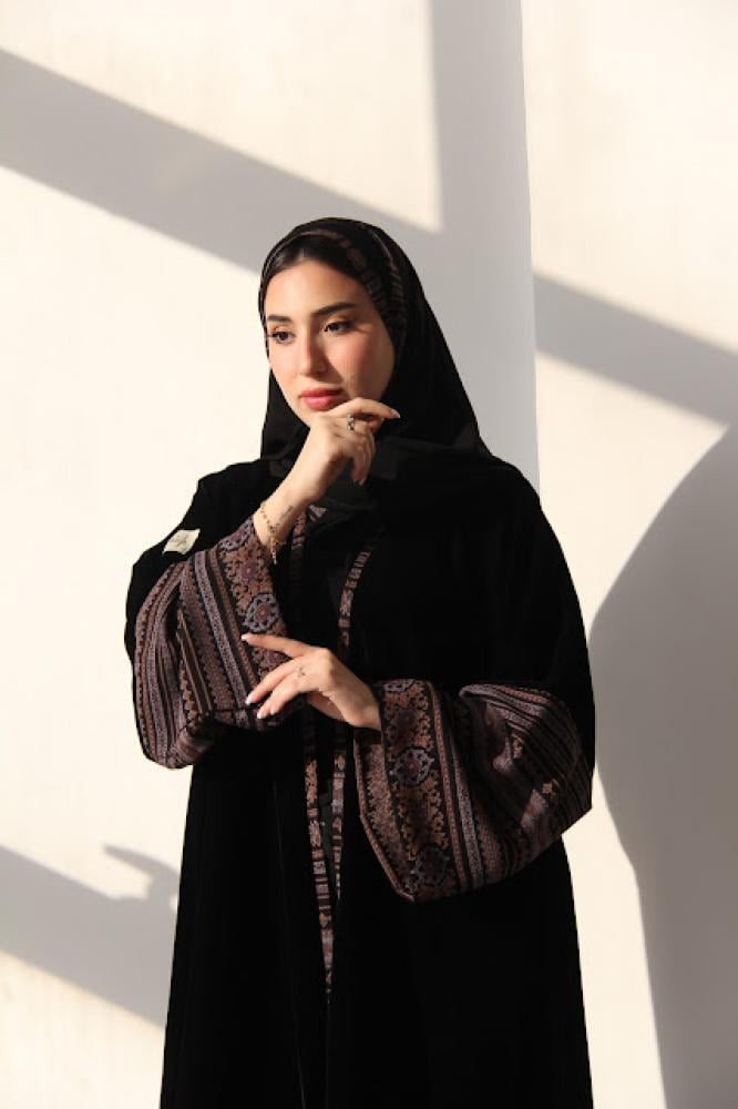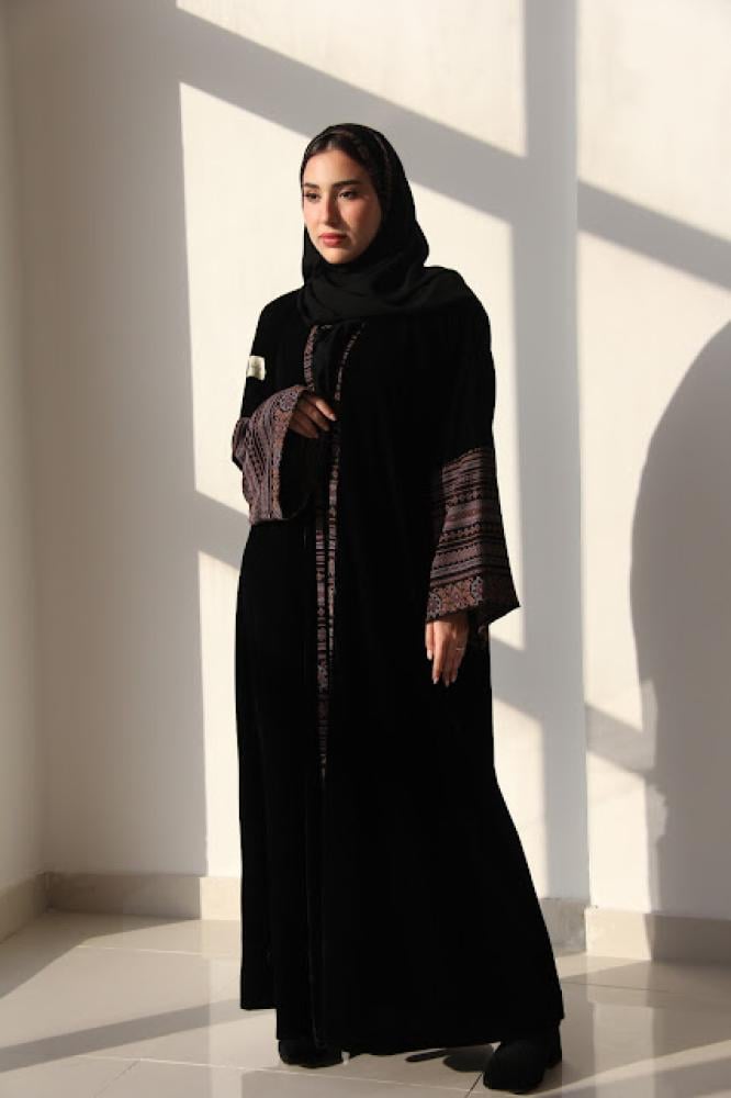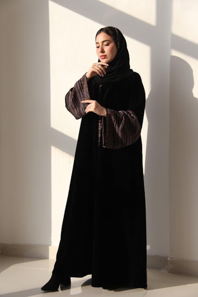 - يجمع تصميم العباية بين الفخامة والدفء، حيث يدمج المخمل الناعم مع الكشمير الفاخر ليمنحك إطلالة أنيقة ومميزة.